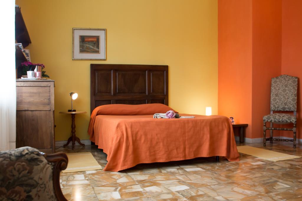 La CAMERA ARANCIONE è una spaziosa e luminosissima camera matrimoniale di di mq.25 in cui prevale un intenso e brillante color aragosta con un terrazzo che si affaccia su piscina e giardino!
